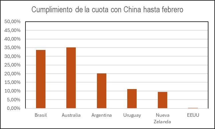 Brasil y Australia ya cumplieron más de un tercio de su cuota de exportación de carne a China en el primer bimestre. Uruguay completó el 11% y Argentina el 20%.