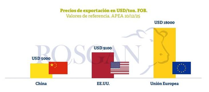 Esto implica que, por cada tonelada embarcada hacia estos destinos (USA y Europa), Argentina llega a duplicar e incluso triplicar el valor obtenido en sus ventas al mercado chino.