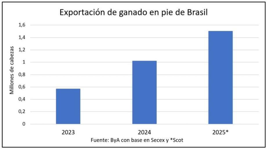 En Brasil se espera cerrar 2025 con 1,5 millones de cabezas exportadas en pie, afirmó la consultora Scot en base a información de representantes del sector.