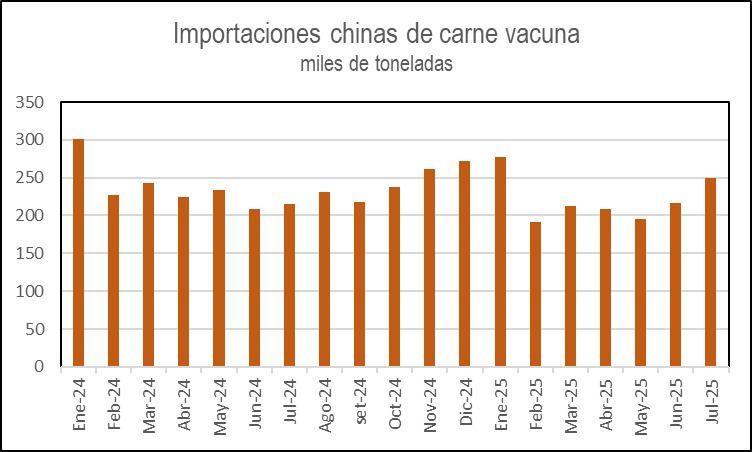 Previsiblemente, en agosto se dio el tercer aumento interanual y mensual en las importaciones chinas de carne vacuna. De acuerdo a los datos de la Administración General de Aduanas, en agosto se dieron importaciones de alrededor de 260.000 toneladas por US$ 1.403 millones, un aumento de 11% en volumen y de 25% en dólares frente a igual mes del año anterior. Entre enero y agosto se importaron 1,813 millones de toneladas por US$ 9.363 millones, una caída de 4% en volumen, pero con una suba de 2,5% en dólares frente a igual período de 2024. En agosto las importaciones de carne de cerdo totalizaron 80.000 toneladas, 12,5% menos que en igual mes del año anterior. Entre enero y agosto se importaron 710.000 toneladas, con una suba interanual de 1,8%. Más stocks y precios internos más altos que en 2024 En China analistas locales indicaron que aumentó el número de stock de carne vacuna. FAXCARNE destacó que en agosto el índice de stocks elaborado por OIG+X -con base a 100 diciembre de 2023- se acercó al 90 luego de haber tocado un piso de menos de 75 en diciembre de 2024. Datos del Ministerio de Agricultura de China mostraron que el precio promedio de la carne vacuna subió 0,2% en la semana cerrada el 18 de setiembre con un valor 3,4% superior a igual período del año pasado. En tanto, el precio del ganado vivo se ubicó 10,9% por encima de un año atrás. FUENTE: Monitor Ganadero |