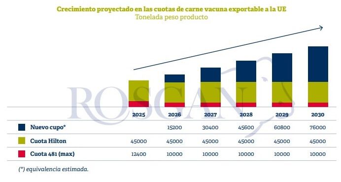 A esto se suma la creación de un nuevo cupo anual de 99.000 toneladas equivalente carcasa —unas 76.000 toneladas peso producto— que se implementará de manera gradual durante cinco años, con un arancel intracuota del 7,5%, muy por debajo del casi 50% vigente fuera de cuota.