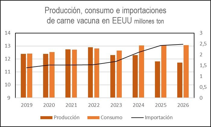 En su informe de diciembre el USDA proyectó que el año que viene las importaciones de carne bovina crezcan 2% frente a 2025 hasta 2,472 millones de toneladas. En octubre -previo a la eliminación de los aranceles- el organismo preveía una caída de 7%.