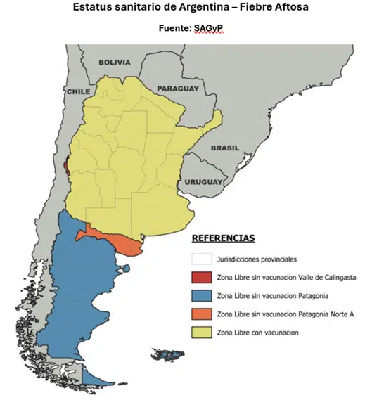 El país cuenta con una amplia zona libre con vacunación, que abarca el centro y norte del territorio, además de tres áreas libres sin vacunación: Patagonia (Norte y Sur), Patagonia Norte A y los Valles de Calingasta en San Juan. Estas regiones reflejan los avances logrados desde el Plan Nacional de Erradicación de Fiebre Aftosa (Resolución Senasa 5/2001), implementado tras la epidemia del 2000-2001.