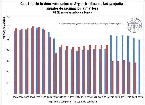 Durante la primera campaña de 2025, se vacunaron 49,4 millones de bovinos, cifra que representa casi la totalidad del stock nacional. Desde 2010, el esquema contempla dos campañas anuales: una general para todas las categorías y una segunda que excluye a vacas, toros y bueyes, que reciben solo una dosis anual.
