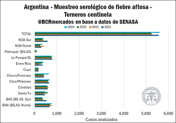 En paralelo, el Programa Nacional de Fiebre Aftosa del SENASA mantiene un monitoreo permanente mediante muestreos en terneros centinela —animales jóvenes sin vacunar—. Entre 2018 y 2024 se analizaron más de 36.000 muestras en 2.400 establecimientos, sin detectar circulación viral.