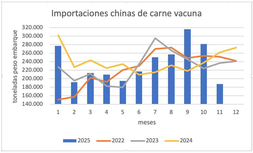 En noviembre, China nacionalizó 187 mil t de carne vacuna, dibujando una escalera descendente pronunciada desde el récord de septiembre, con 316 mil t, y las 281 mil t de octubre.