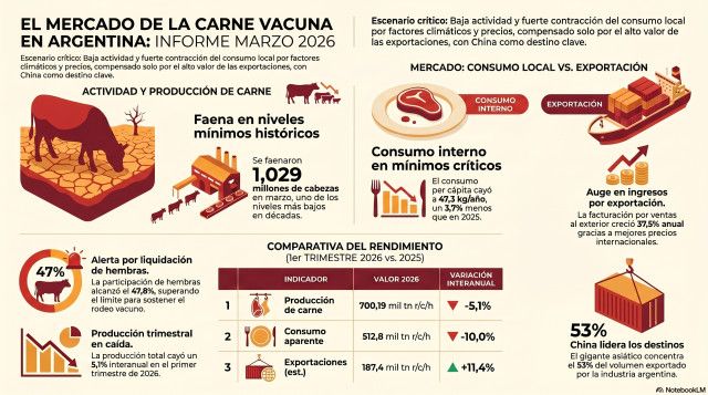 En marzo se faenaron 1,029 millones de cabezas, uno de los registros más bajos de las últimas décadas para este mes .