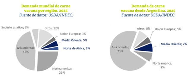 No obstante, para Argentina la región presenta una mayor relevancia. Destinos como Israel, Qatar y Emiratos Árabes Unidos concentran más del 7% de los embarques totales y cerca del 11% de las divisas generadas por exportaciones de carne vacuna.