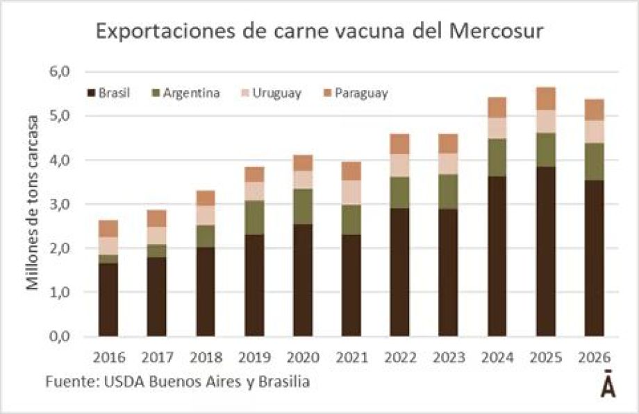Las exportaciones de carne vacuna del Mercosur caerían en unas 256 mil toneladas peso carcasa en 2026, dejando atrás el récord previsto para este año. A ese número se llega teniendo en cuenta las proyeccione…