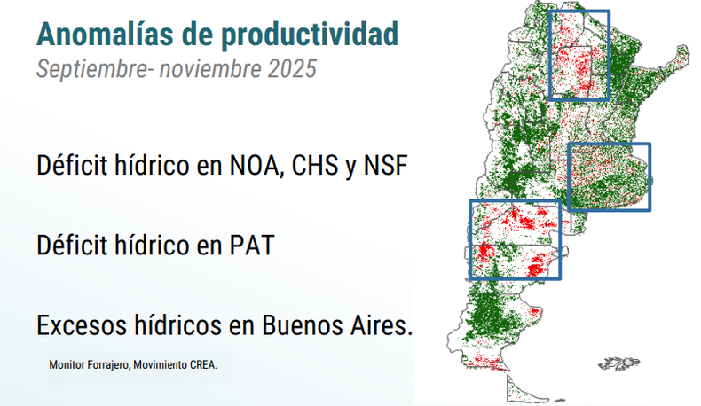 De todas maneras, regiones productivas del norte argentino y de la Patagonia presentan anomalías de productividad causadas por restricciones hídricas, mientras que en diferentes localidades bonaerenses persisten problemas derivados de excesos hídricos.