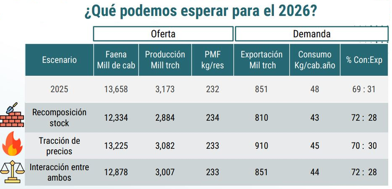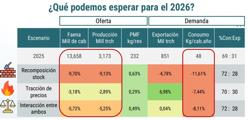 El escenario que se encuentra a mitad de camino entre ambos –aún considerando un aumento del peso medio de faena– permitiría sostener la oferta exportable de carne vacuna en 2026, pero no así el consumo interno, lo que representaría una oportunidad para los productores de carne porcina y aviar.