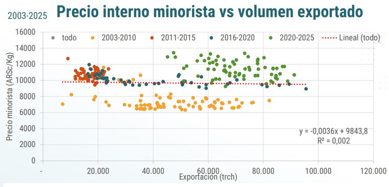 Es importante destacar que los registros históricos muestran que no existe correlación alguna entre el volumen exportado con la dinámica de los precios minoristas de la carne vacuna en el mercado argentino.