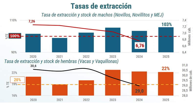 El año 2025, al igual que el 2024, finalizará con una reducción del stock bovino. Con el aumento de la participación de vaquillonas en la faena, se espera que la producción de terneros siga limitada, al tiempo que la tasa de extracción de machos permanece fuera del nivel de equilibrio.