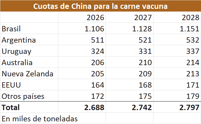 El caso de Brasil no es muy distinto. Según estimaciones de un trader, habría al menos 300.000 toneladas de carne brasileña que quedaron fuera de los registros de diciembre y empezaron a descontar cuota desde el 1° de enero. “Brasil no tiene 1,1 millones de toneladas disponibles como se cree. Con suerte, tiene entre 700.000 y 750.000. Si siguen cargando más de 100.000 por mes, se quedan sin cuota entre abril y mayo”, advirtió.
