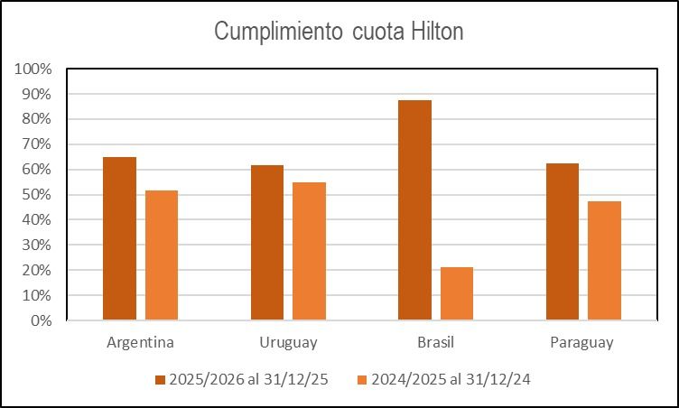 Los datos de la Comisión Europea marcan un nivel de cumplimiento más acelerado dentro de la Hilton lo que podría, eventualmente, colocar más carne en 2026 por fuera de los cupos.