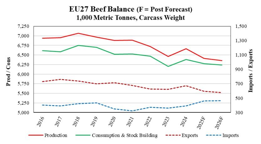 | Los técnicos del USDA en la Unión Europea proyectaron para 2026 una nueva caída en la producción de carne vacuna en el bloque con un incremento marginal de las importaciones. Para 2026 se prevé que se mantenga la contracción en el rodeo vacuno, la producción de terneros y la faena, aunque a un ritmo menor que el año anterior. En el informe se pronosticó que la faena vacuna caerá en 300.000 cabezas hasta 21,35 millones de animales. La producción bajaría a 6,35 millones de toneladas frente a los 6,410 millones de 2025. El año pasado las importaciones de carne vacuna saltaron 17% frente a 2024 llegando a 460.000 toneladas con un fuerte crecimiento en las compras desde el Mercosur. Para 2026 se proyecta un volumen de importaciones de 465.000 toneladas. En el reporte se destacó que en 2025 se dio un salto de 37,5% en las importaciones de carne vacuna congelada de menor valor y de 9,9% en los cortes frescos de precios más altos. Los técnicos prevén una ligera moderación en el consumo de 6,275 millones a 6,24 millones de toneladas. En la gráfica se muestra la evolución de la producción, importaciones, consumo y exportaciones hasta 2025 con la previsión para 2026. FUENTE: Monitor Ganadero |